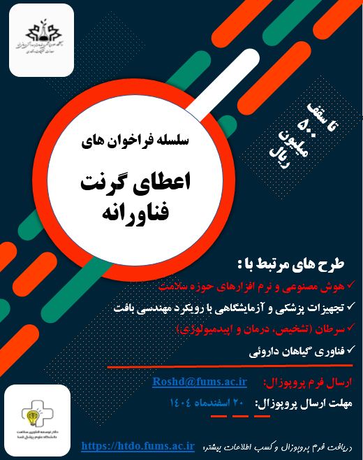 معاونت تحقیقات و فناوری دانشگاه علوم پزشکی فسا به جهت اجرای رسالت خود در راستای توسعه و ارتقا فناوری و همچنین بهره گیری از ظرفیت اعضای هیأت علمی، دانشجویان، فناوران و نوآوران سراسر کشور ، در نظر دارد سلسله فراخوان های جذب طرح های فناورانه و اعطای گرنت به طرح های فناورانه و محصول محور را مطابق با عناوینی زیر اجرا نماید.